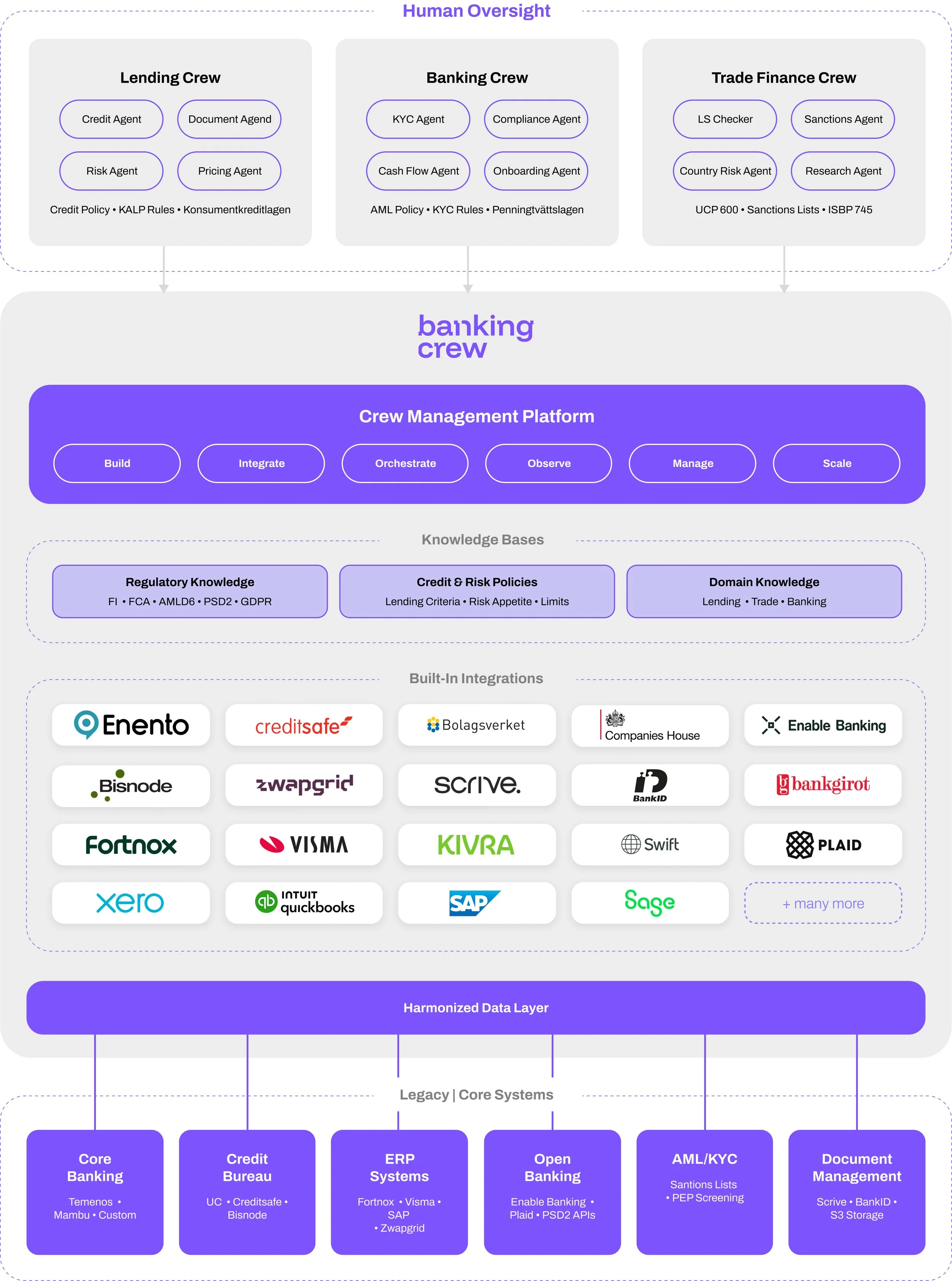 Specialized AI crews for lending, banking and trade finance — all regulation-aware. Some example crews: